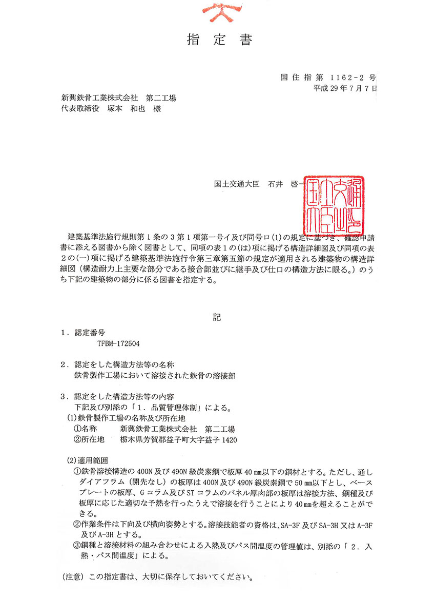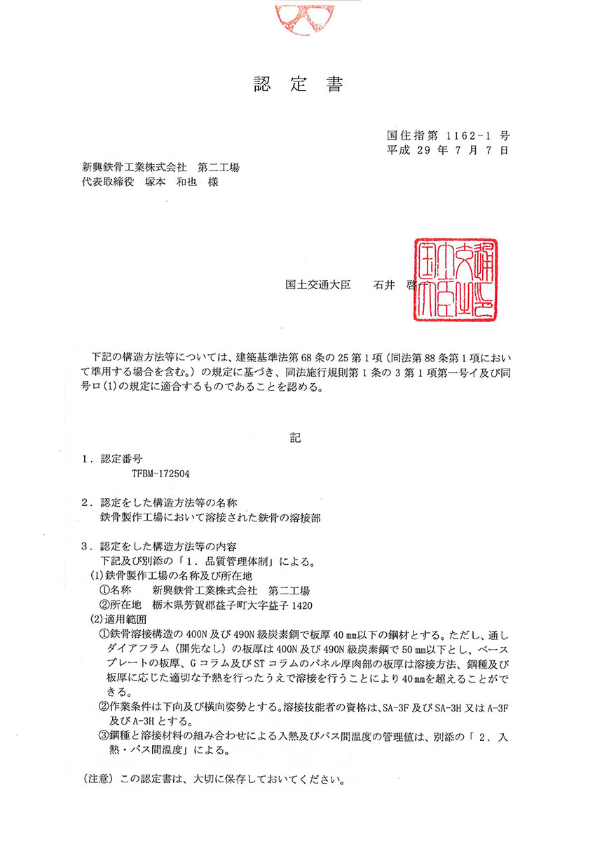 新興鉄骨工業株式会社は鉄骨製作工場の性能評価基準におけるMグレード認定工場です。